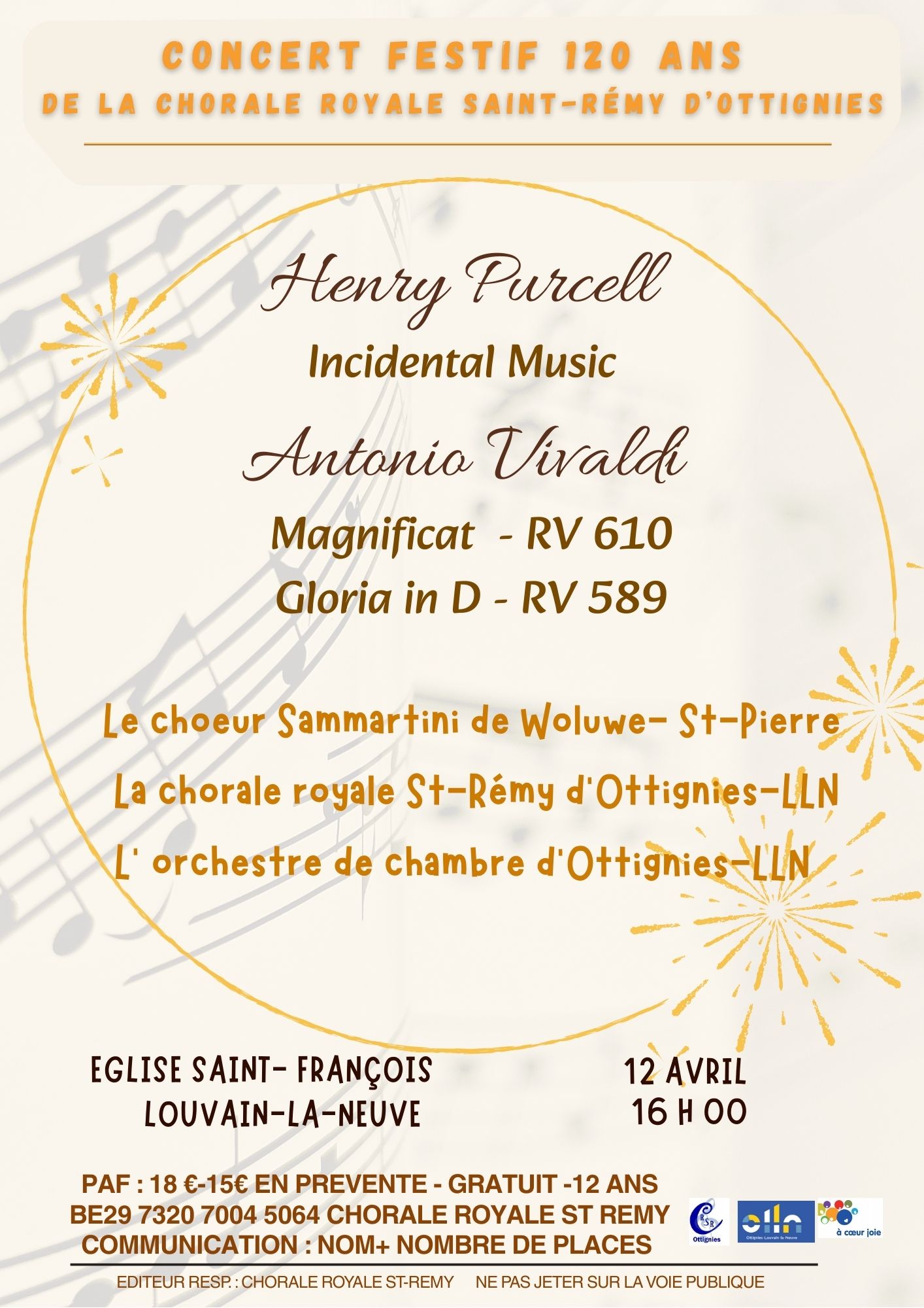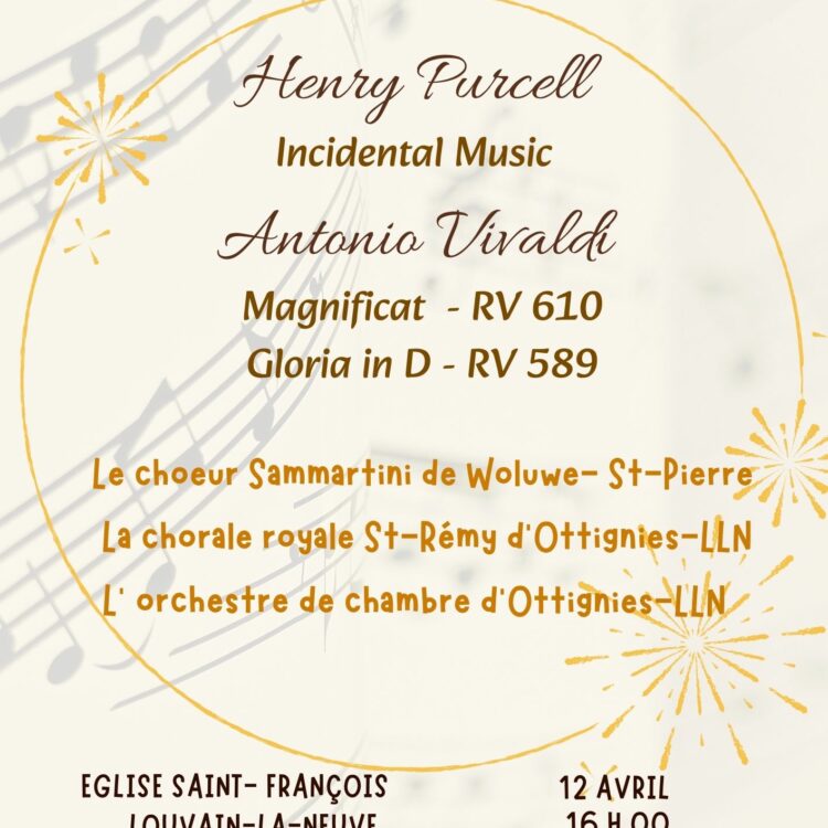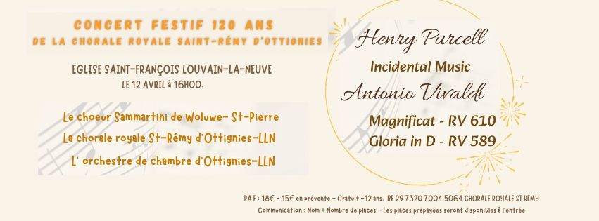 Les deux ensembles vocaux seront accompagnés par l’orchestre de chambre d’Ottignies -LLN qui mettra, en ouverture, le compositeur anglais Henry Purcell à l’honneur.Un concert festif pour fêter 120 ans de musique et de convivialité !
