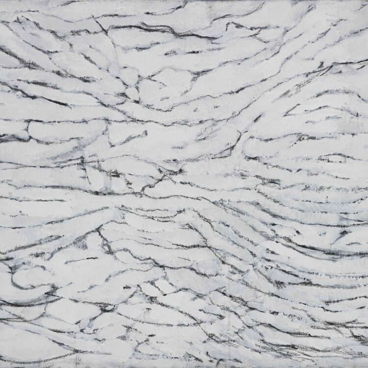 À partir de la fin des années 1990, il laisse plus de place au vide, à la lumière, à des signes mystérieux plutôt qu’à des formes reconnaissables. Les paysages se fissurent, se déforment, se remplissent de traits noirs appliqués, de courbes et de droites et de coulées sombres, de rondeurs répétitives. Des formes humaines solitaires, fragmentées apparaissent : silhouettes enfermées, démembrées. Ce sont les oeuvres de cette dernière période, pas ou peu exposées, qui sont réunies à l’Espace 001.